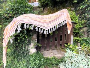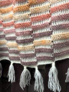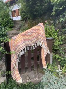 Shawl made from variegared yarn. The video to the pattern is available here. I crocheted the first part according to this video. I have a repeat of 10 edc (extended double crochets) in one small rectangle.