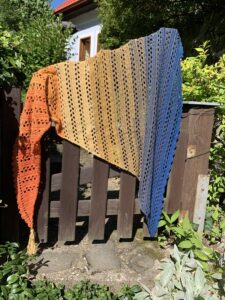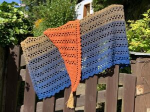 A crocheted asymmetrical triangular wrap with an elegant ombré gradient.