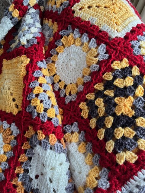 Deka v šedo-žlto-červenej kombinácii. Skladá sa zo 77 štvorcov.  Technika: háčkovanie …čítať viac »