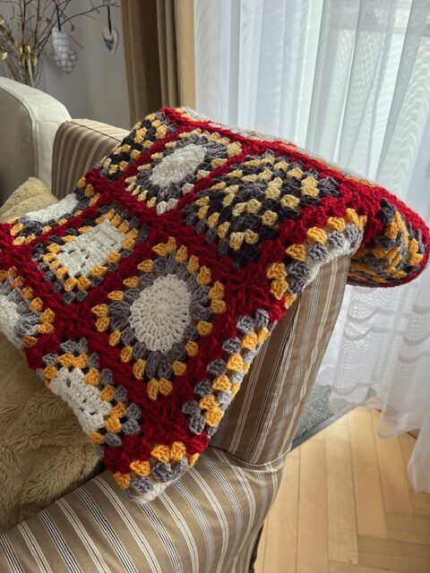 Deka v šedo-žlto-červenej kombinácii. Skladá sa zo 77 štvorcov.  Technika: háčkovanie …čítať viac »