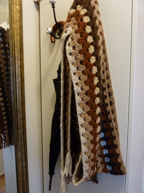 Šál zo zbytkov priadze, háčkovaný dlhými stĺpikmi veľmi jednoduchým vzorom. …čítať viac »
