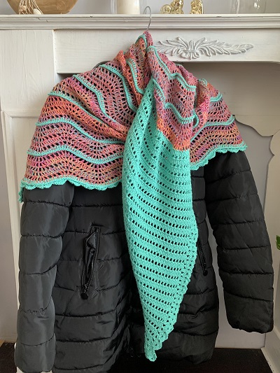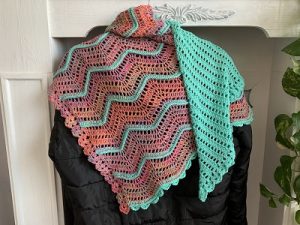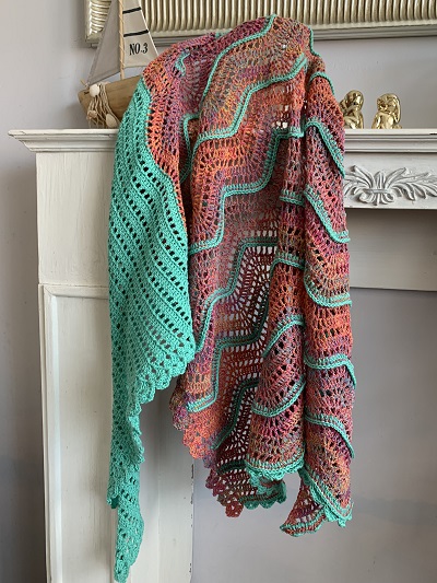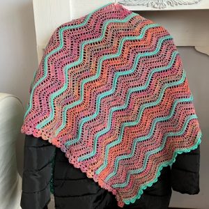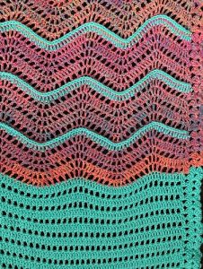 Háčkovaný šál z priadze s farebným efektom. Telo šálu je háčkované vzorom z dlhých stĺpikov. Striedajú sa riadky s medzerami a plné riadky. Po rovných riadkoch nasledujú vlnité riadky. .