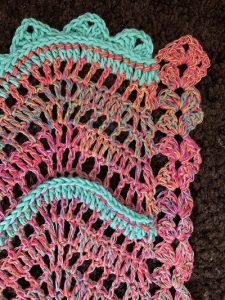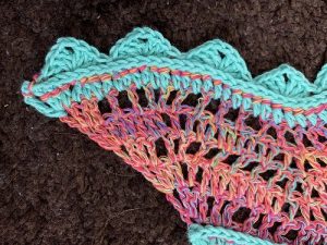 Začíname v užšom rohu zelenou priadzou a postupne pridávame stĺpiky a očká na jednej strane šatky. Na druhej strane háčkujeme ozdobný okraj.