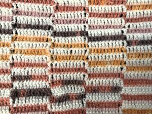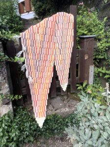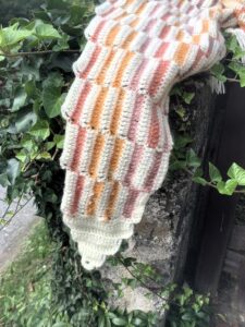 Šál háčkovaný z ombre priadze. Video k vzoru je k dispozícii tu. Prvú časť som uháčkovala podľa tohto videa. Mám opakovanie 10 prds (predĺžených dvojitých stĺpikov) v jednom malom obdĺžniku.