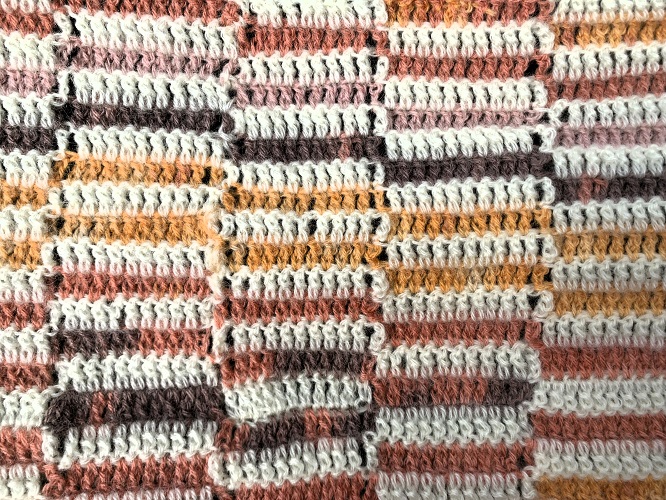 1.r: priadzu napojíme na farebný bočný rad, 4 ro, 20 prds, (ukončíme na konci farebného bočného radu), otočíme
